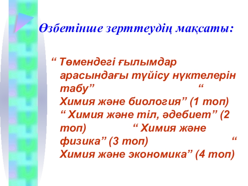 “ Химия және биология” (1 топ) “ Химия және тіл, әдебиет” (2 топ) “ Химия және физика” (3 топ) “ Химия және экономика” (4 топ)
