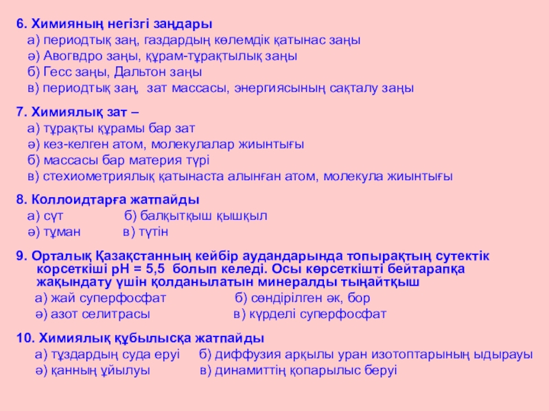 9. Орталық Қазақстанның кейбір аудандарында топырақтың сутектік корсеткіші рН = 5,5 болып келеді. Осы көрсеткішті бейтарапқа жақындату үшін қолданылатын минералды тыңайтқыш