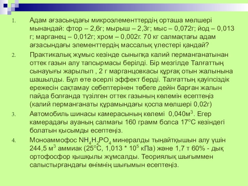 2,3г; мыс – 0,072г; йод – 0,013г; марганец – 0,012г; хром – 0,002г. 70 кг салмақтағы адам ағзасындағы элементтердің массалық үлестері қандай?