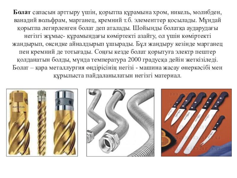 Слайд 7Болат сапасын арттыру үшін, қорытпа құрамына хром, никель, молибден, ванадий вольфрам,