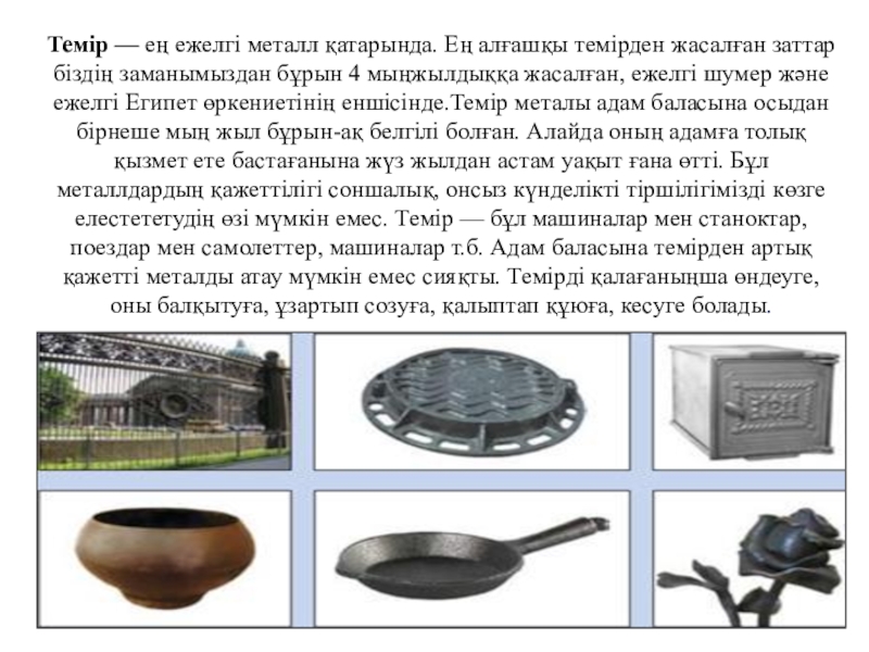 Слайд 4Темір — ең ежелгі металл қатарында. Ең алғашқы темірден жасалған заттар