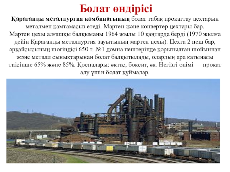 Слайд 9Қарағанды металлургия комбинатының болат табақ прокаттау цехтарын металмен қамтамасыз етеді. Мартен және
