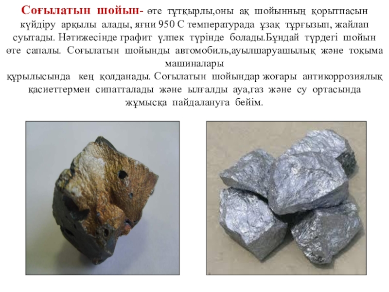 Слайд 20Соғылатын шойын- өте тұтқырлы,оны ақ шойынның қорытпасын күйдіру арқылы алады, яғни