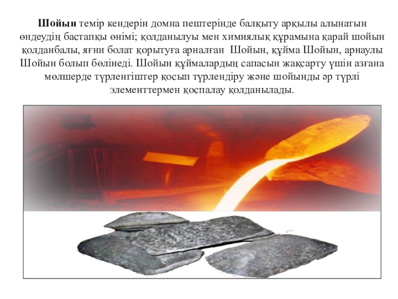 Слайд 13Шойын жақсы құйылатын қасиеті бар темірмен көміртектің (2% жоғарғы) қорытпасы; темірдің