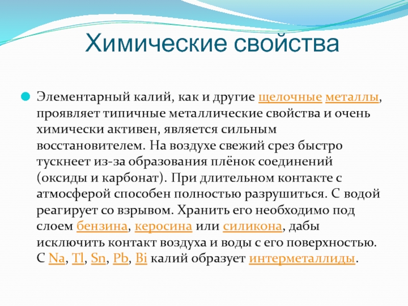 и очень химически активен, является сильным восстановителем. На воздухе свежий срез быстро тускнеет из-за образования плёнок соединений (оксиды и карбонат). При длительном контакте с атмосферой способен полностью разрушиться. С водой реагирует со взрывом. Хранить его необходимо под слоем бензина, керосина или силикона, дабы исключить контакт воздуха и воды с его поверхностью. С Na, Tl, Sn, Pb, Bi калий образует интерметаллиды.
