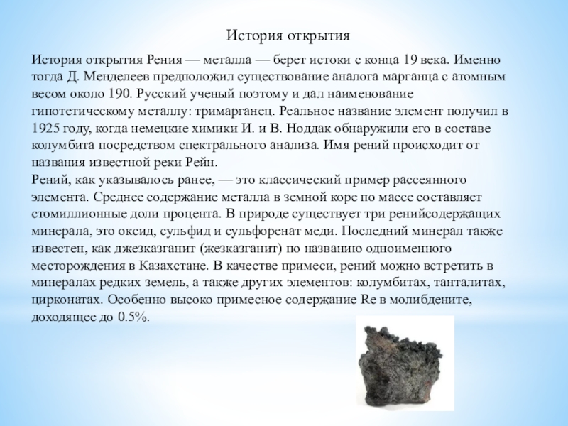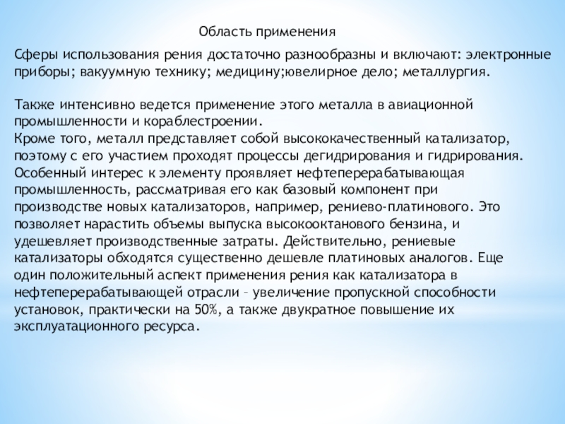Кроме того, металл представляет собой высококачественный катализатор, поэтому с его участием проходят процессы дегидрирования и гидрирования. Особенный интерес к элементу проявляет нефтеперерабатывающая промышленность, рассматривая его как базовый компонент при производстве новых катализаторов, например, рениево-платинового. Это позволяет нарастить объемы выпуска высокооктанового бензина, и удешевляет производственные затраты. Действительно, рениевые катализаторы обходятся существенно дешевле платиновых аналогов. Еще один положительный аспект применения рения как катализатора в нефтеперерабатывающей отрасли – увеличение пропускной способности установок, практически на 50%, а также двукратное повышение их эксплуатационного ресурса.