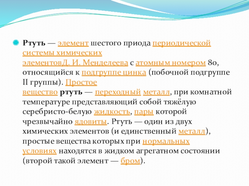Ртуть известна с древних времен. Нередко её находили в самородном виде (жидкие капли на горных породах), но чаще получали обжигом природной киновари. Древние греки и римляне использовали ртуть для очистки золота (амальгамирование), знали о токсичности самой ртути и её соединений, в частности сулемы. Много веков алхимики считали ртуть главной составной частью всех металлов и полагали, что если жидкой ртути возвратить твёрдость при помощи серы или мышьяка, то получится золото. Выделение ртути в чистом виде было описано шведским химиком Георгом Брандтом в 1735 г. Для представления элемента как у алхимиков, так и в нынешнее время используется символ планеты Меркурий. Но принадлежность ртути к металлам была доказана только трудами Ломоносова и Брауна, которые в декабре 1759 года смогли заморозить ртуть и установить её металлические свойства в твёрдом состоянии: ковкость, электропроводность и др