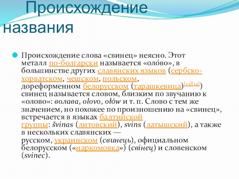 Происхождение слова «свинец» неясно. Этот металл по-болгарски называется «оло́во»,