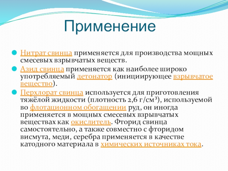 Азид свинца применяется как наиболее широко употребляемый детонатор (инициирующее взрывчатое вещество).