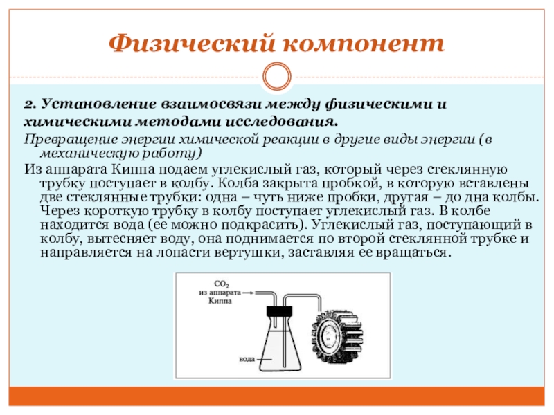 Из аппарата Киппа подаем углекислый газ, который через стеклянную трубку поступает в колбу. Колба закрыта пробкой, в которую вставлены две стеклянные трубки: одна – чуть ниже пробки, другая – до дна колбы. Через короткую трубку в колбу поступает углекислый газ. В колбе находится вода (ее можно подкрасить). Углекислый газ, поступающий в колбу, вытесняет воду, она поднимается по второй стеклянной трубке и направляется на лопасти вертушки, заставляя ее вращаться.