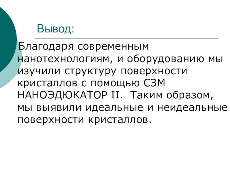 Вывод:  Благодаря современным нанотехнологиям, и оборудованию мы изучили структуру поверхности кристаллов с помощью СЗМ НАНОЭДЮКАТОР II.