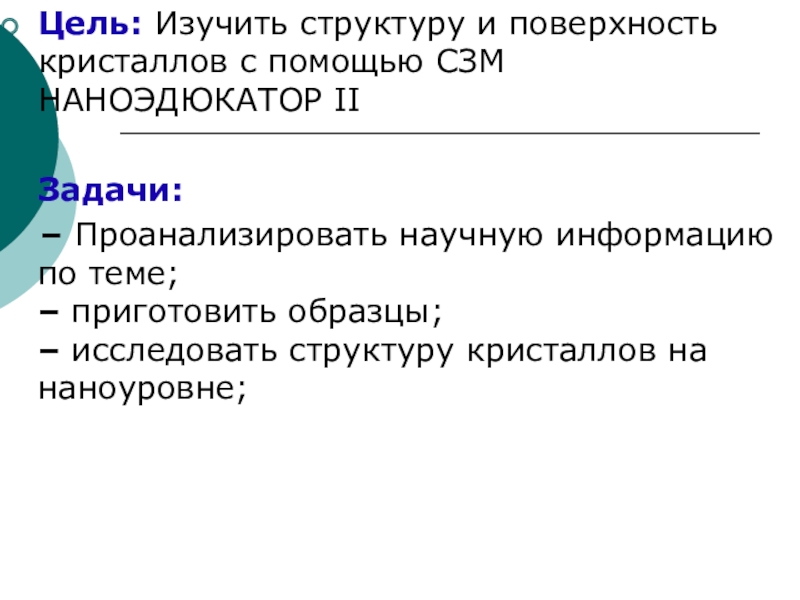 Цель: Изучить структуру и поверхность кристаллов с помощью СЗМ НАНОЭДЮКАТОР IIЗадачи: – Проанализировать научную информацию по теме; – приготовить образцы; – исследовать структуру кристаллов на наноуровне;
