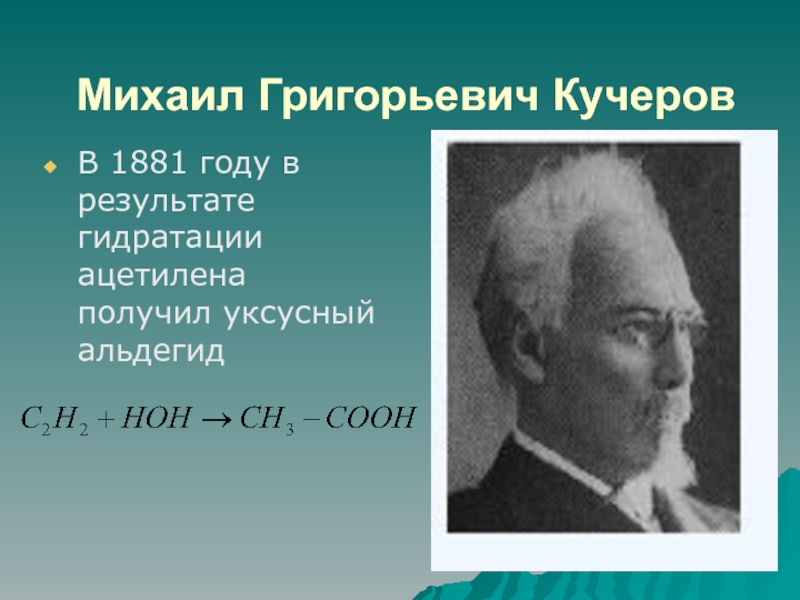 Михаил Григорьевич Кучеров В 1881 году в результате гидратации ацетилена получил уксусный альдегид