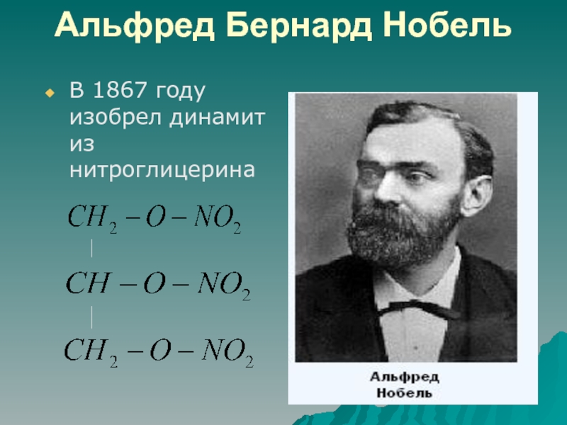 Альфред Бернард Нобель В 1867 году изобрел динамит из нитроглицерина