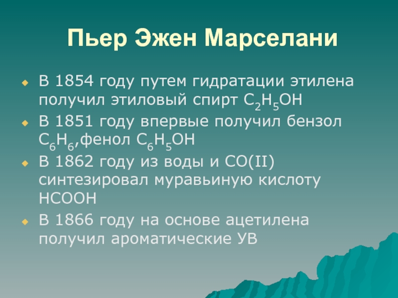 Пьер Эжен МарселаниВ 1854 году путем гидратации этилена получил этиловый спирт C2H5OHВ 1851 году впервые получил бензол