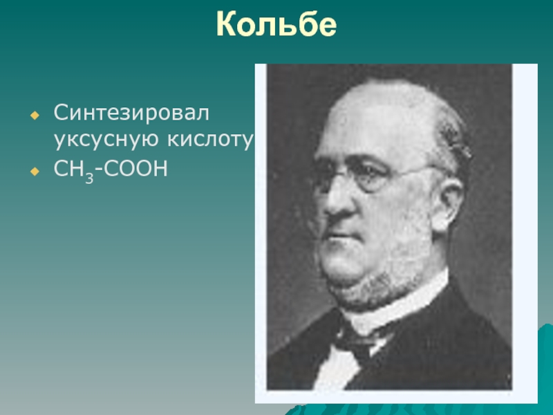 Кольбе Синтезировал уксусную кислоту CH3-COOH