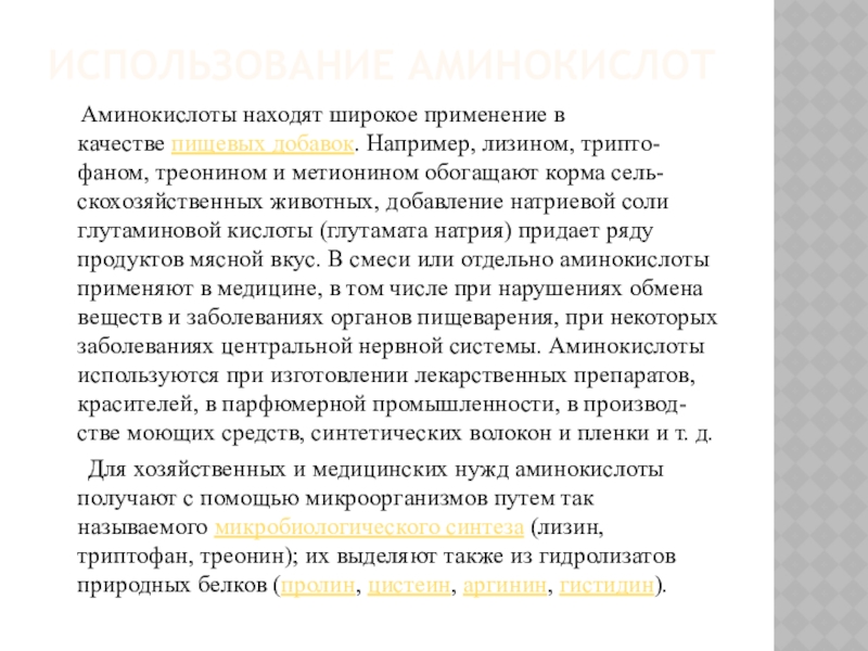 Например, лизином, трипто-фаном, треонином и метионином обогащают корма сель-скохозяйственных животных, добавление натриевой соли глутаминовой кислоты (глутамата натрия) придает ряду продуктов мясной вкус. В смеси или отдельно аминокислоты применяют в медицине, в том числе при нарушениях обмена веществ и заболеваниях органов пищеварения, при некоторых заболеваниях центральной нервной системы. Аминокислоты используются при изготовлении лекарственных препаратов, красителей, в парфюмерной промышленности, в производ-стве моющих средств, синтетических волокон и пленки и т. д.