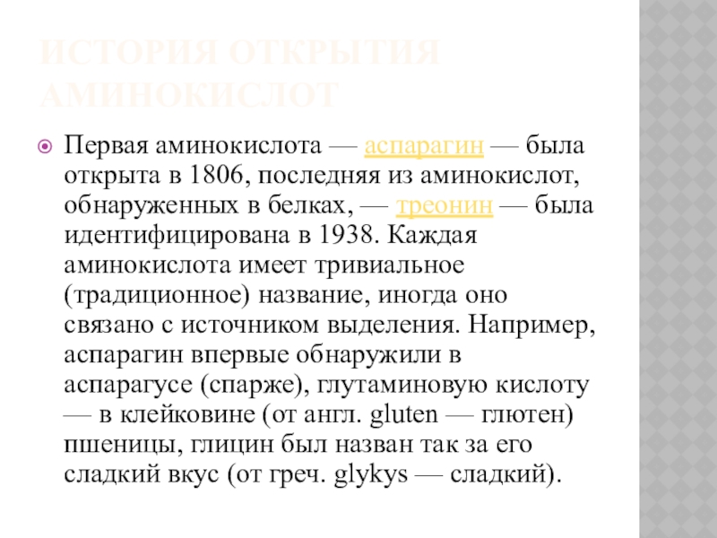 аминокислот, обнаруженных в белках, — треонин — была идентифицирована в 1938. Каждая аминокислота имеет тривиальное (традиционное) название, иногда оно связано с источником выделения. Например, аспарагин впервые обнаружили в аспарагусе (спарже), глутаминовую кислоту — в клейковине (от англ. gluten — глютен) пшеницы, глицин был назван так за его сладкий вкус (от греч. glykys — сладкий).