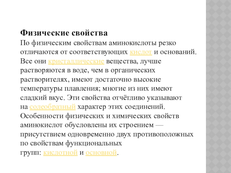 они кристаллические вещества, лучше растворяются в воде, чем в органических растворителях, имеют достаточно высокие температуры плавления; многие из них имеют сладкий вкус. Эти свойства отчётливо указывают на солеобразный характер этих соединений. Особенности физических и химических свойств аминокислот обусловлены их строением — присутствием одновременно двух противоположных по свойствам функциональных групп: кислотной и основной.