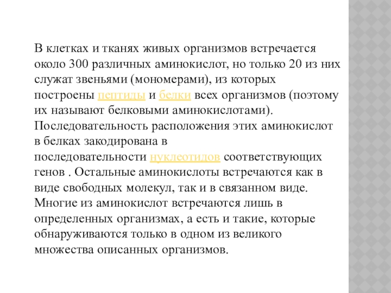 Слайд 12В клетках и тканях живых организмов встречается около 300 различных аминокислот,