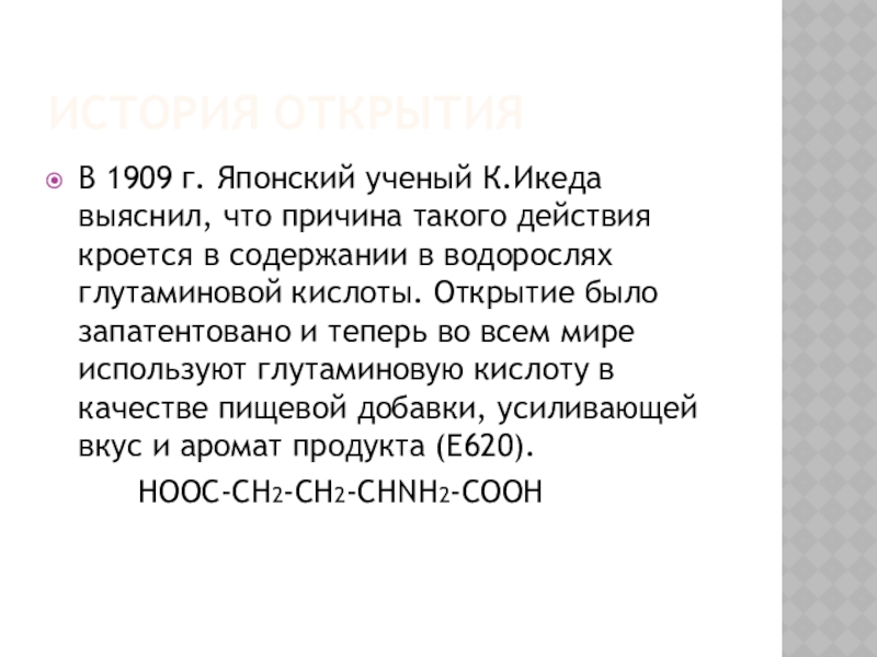 действия кроется в содержании в водорослях глутаминовой кислоты. Открытие было запатентовано и теперь во всем мире используют глутаминовую кислоту в качестве пищевой добавки, усиливающей вкус и аромат продукта (Е620).