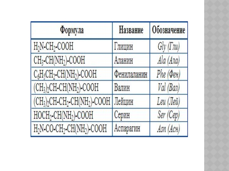 Наибольший интерес представляют 20 L-α-аминокислот (аланин, аргинин, аспарагин и другие),