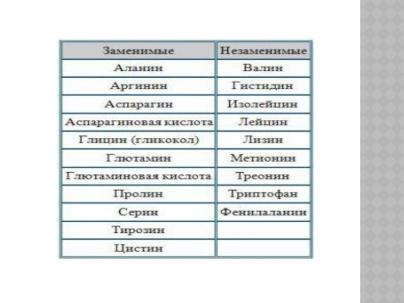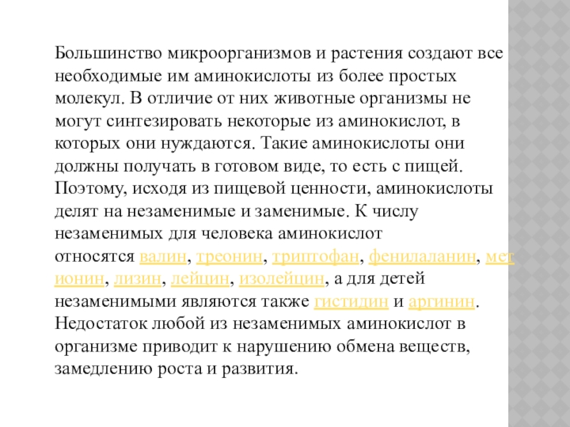простых молекул. В отличие от них животные организмы не могут синтезировать некоторые из аминокислот, в которых они нуждаются. Такие аминокислоты они должны получать в готовом виде, то есть с пищей. Поэтому, исходя из пищевой ценности, аминокислоты делят на незаменимые и заменимые. К числу незаменимых для человека аминокислот относятся валин, треонин, триптофан, фенилаланин, метионин, лизин, лейцин, изолейцин, а для детей незаменимыми являются также гистидин и аргинин. Недостаток любой из незаменимых аминокислот в организме приводит к нарушению обмена веществ, замедлению роста и развития.