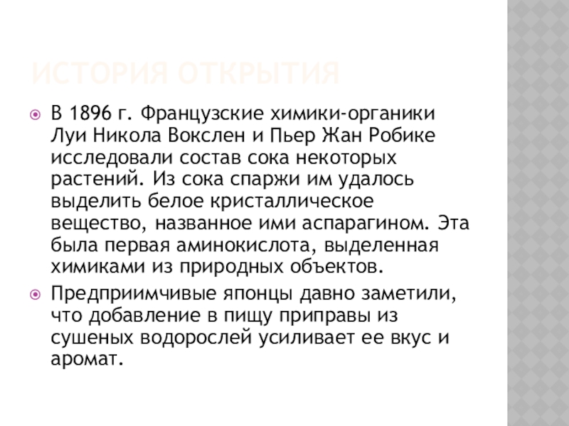 Жан Робике исследовали состав сока некоторых растений. Из сока спаржи им удалось выделить белое кристаллическое вещество, названное ими аспарагином. Эта была первая аминокислота, выделенная химиками из природных объектов.