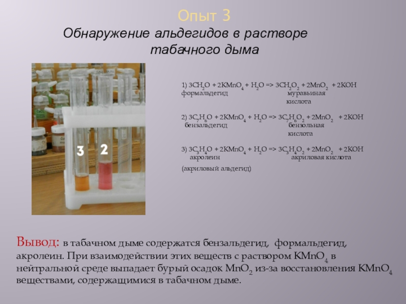 3) 3C3H4O + 2KMnO4 + H2O => 3C3H4O2 + 2MnO2 + 2KOH