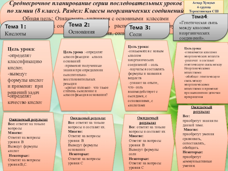 Среднесрочное планирование серии последовательных уроков по химии (8 класс). Раздел: Классы неорганических соединений