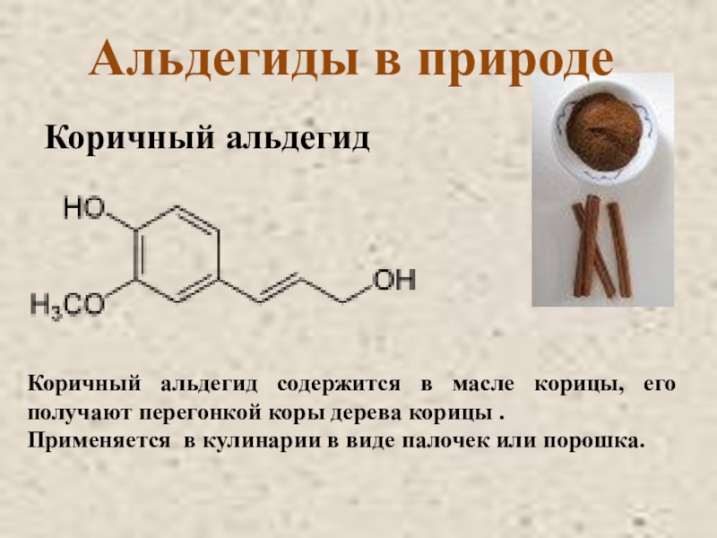 Коричный альдегид Коричный альдегид содержится в масле корицы, его получают перегонкой коры дерева корицы . Применяется в