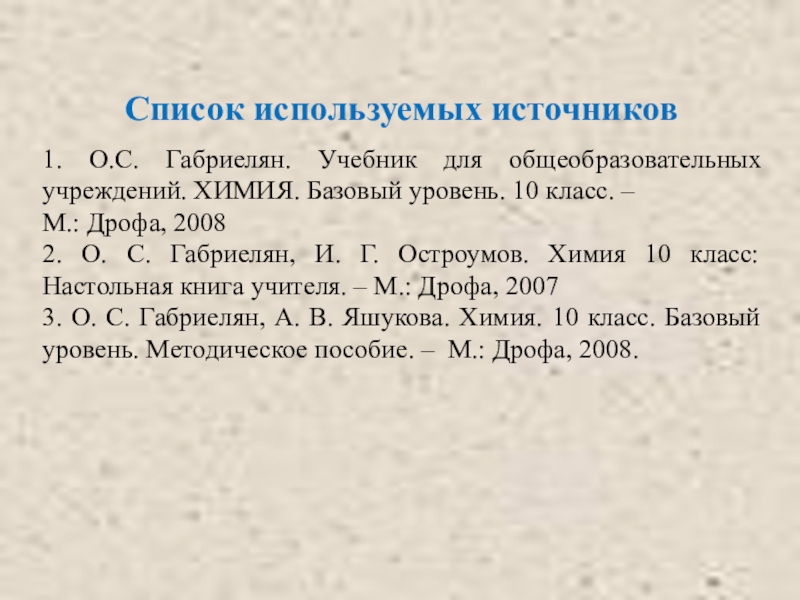 Список используемых источников1. О.С. Габриелян. Учебник для общеобразовательных учреждений. ХИМИЯ. Базовый уровень. 10 класс. – М.: Дрофа,