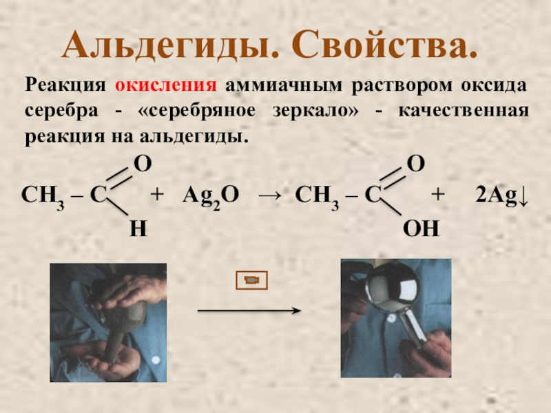 Реакция окисления аммиачным раствором оксида серебра - «серебряное зеркало» - качественная реакция на альдегиды.Альдегиды. Свойства.