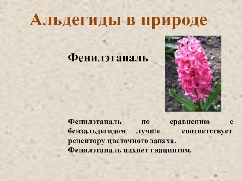 ФенилэтанальФенилэтаналь по сравнению с бензальдегидом лучше соответствует рецептору цветочного запаха. Фенилэтаналь пахнет гиацинтом.Альдегиды в природе