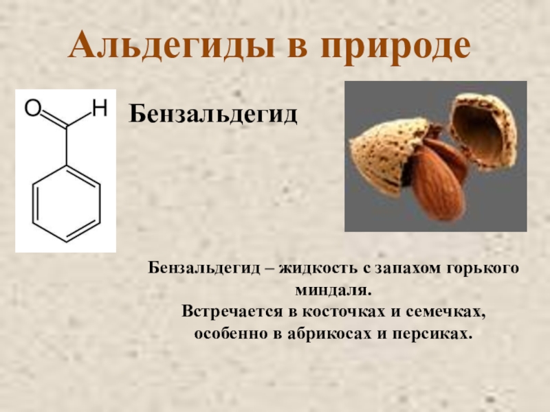 БензальдегидБензальдегид – жидкость с запахом горького миндаля.Встречается в косточках и семечках, особенно в абрикосах и персиках.Альдегиды в