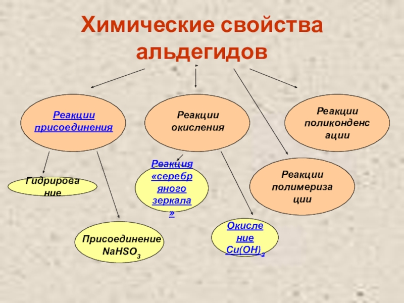 Химические свойства альдегидовРеакцииполиконденсацииРеакцииприсоединенияРеакция«серебряногозеркала»ОкислениеCu(OH)2РеакцииокисленияГидрированиеПрисоединениеNaHSO3Реакцииполимеризации