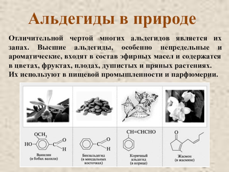Отличительной чертой многих альдегидов является их запах. Высшие альдегиды, особенно непредельные и ароматические, входят в состав эфирных