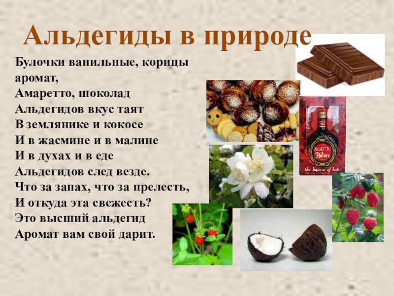 Булочки ванильные, корицы аромат,Амаретто, шоколадАльдегидов вкус таятВ землянике и кокосеИ в жасмине и в малинеИ в духах