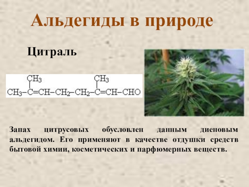 Слайд 18Запах цитрусовых обусловлен данным диеновым альдегидом. Его применяют в качестве отдушки
