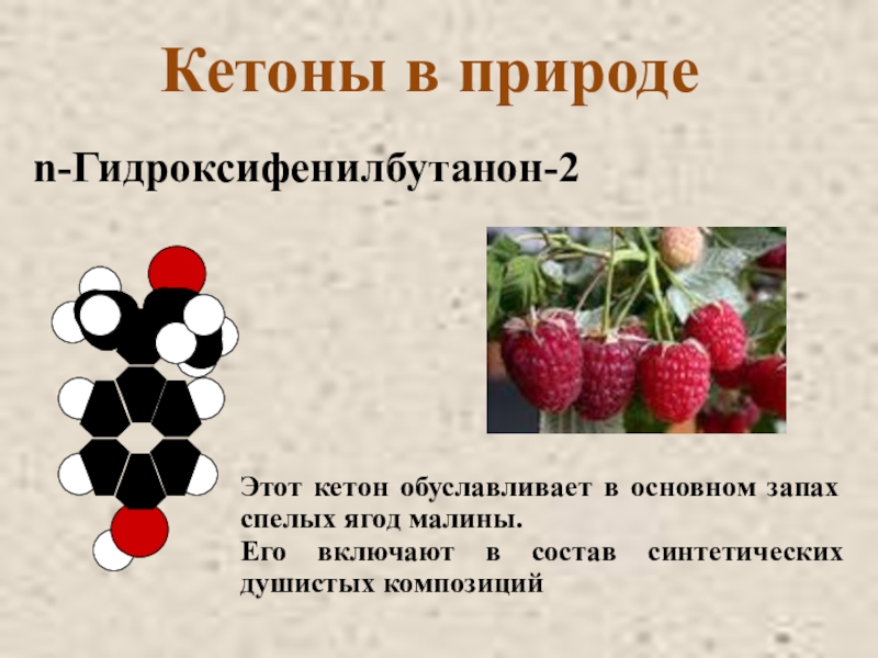 n-Гидроксифенилбутанон-2Этот кетон обуславливает в основном запах спелых ягод малины. Его включают в состав синтетических душистых композицийКетоны в