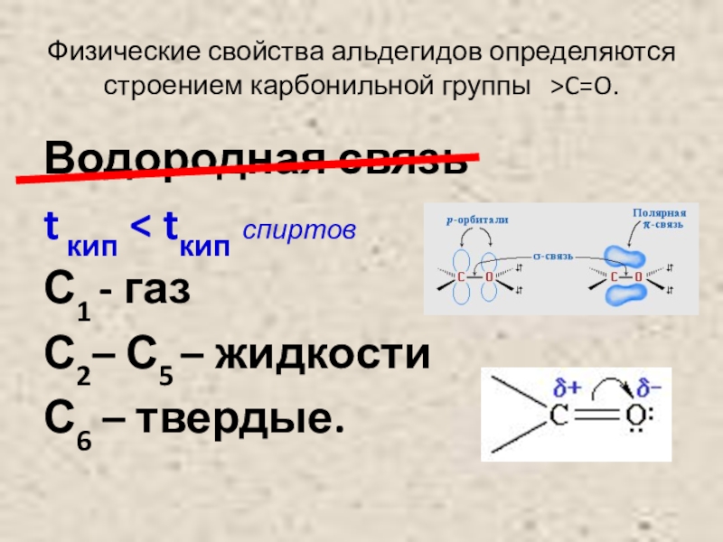 Слайд 7Физические свойства альдегидов определяются строением карбонильной группы >C=O.