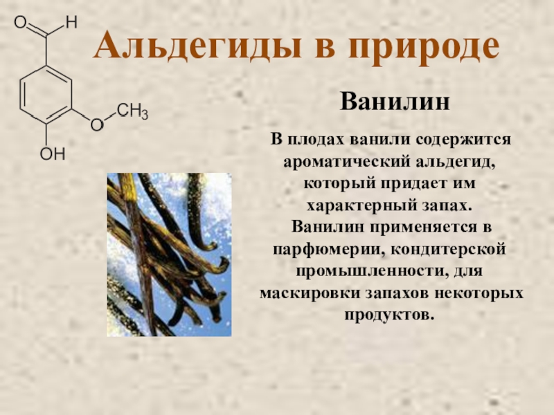 В плодах ванили содержится ароматический альдегид, который придает им характерный запах. Ванилин применяется в парфюмерии, кондитерской