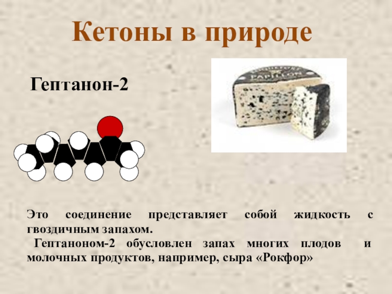 Это соединение представляет собой жидкость с гвоздичным запахом. Гептаноном-2 обусловлен запах многих плодов и молочных продуктов, например,