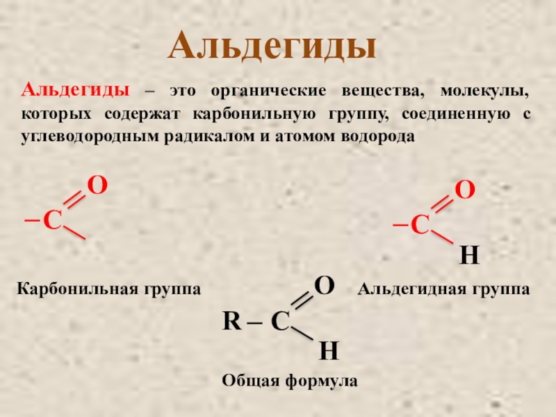 Альдегиды – это органические вещества, молекулы, которых содержат карбонильную группу, соединенную с углеводородным радикалом и атомом водородаОбщая формулаАльдегидная группаКарбонильная группаАльдегиды