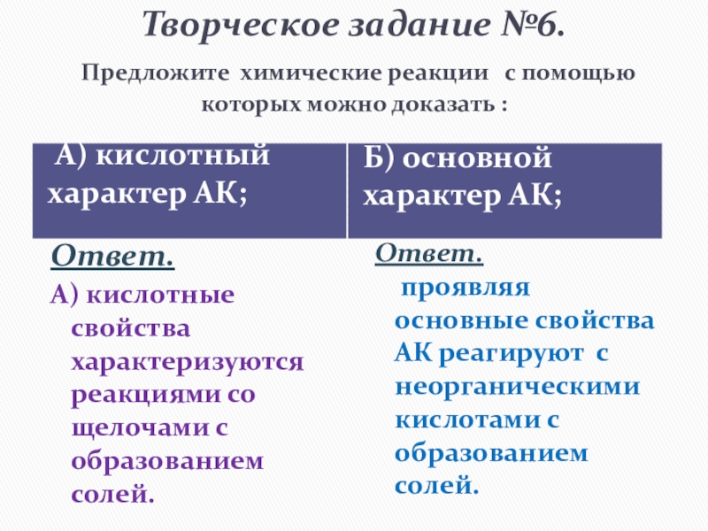 А) кислотные свойства характеризуются реакциями со щелочами с образованием солей.