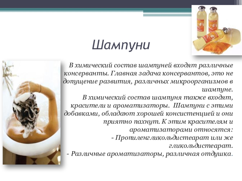 В химический состав шампуней входят различные консерванты. Главная задача консервантов, это