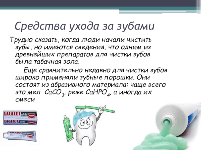 Еще сравнительно недавно для чистки зубов широко применяли зубные порошки. Они состоят из абразивного материала: чаще всего это мел CaCO3, реже CaHPO4, а иногда их смеси
