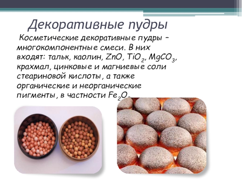 Косметические декоративные пудры – многокомпонентные смеси. В них