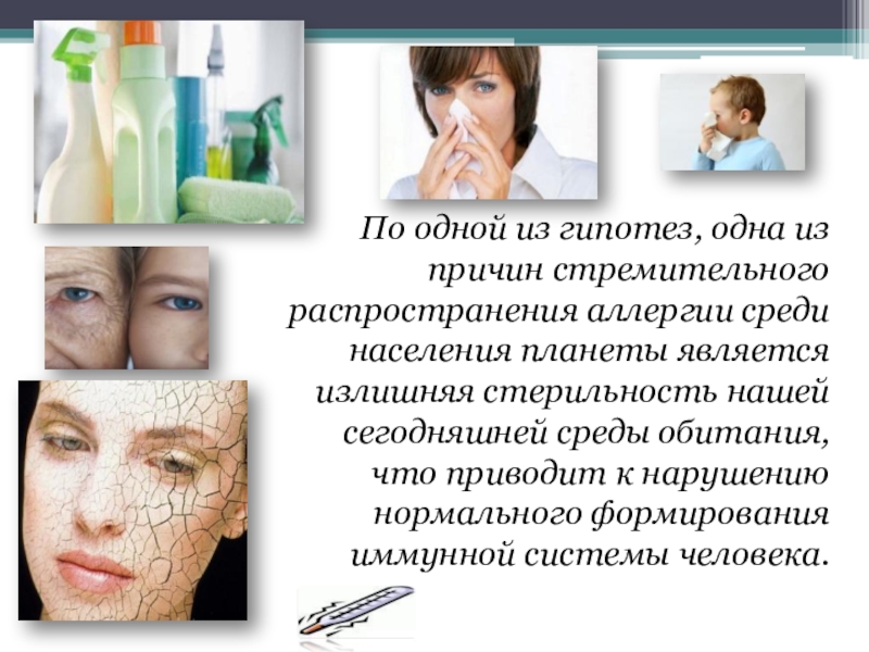 Слайд 20По одной из гипотез, одна из причин стремительного распространения аллергии среди
