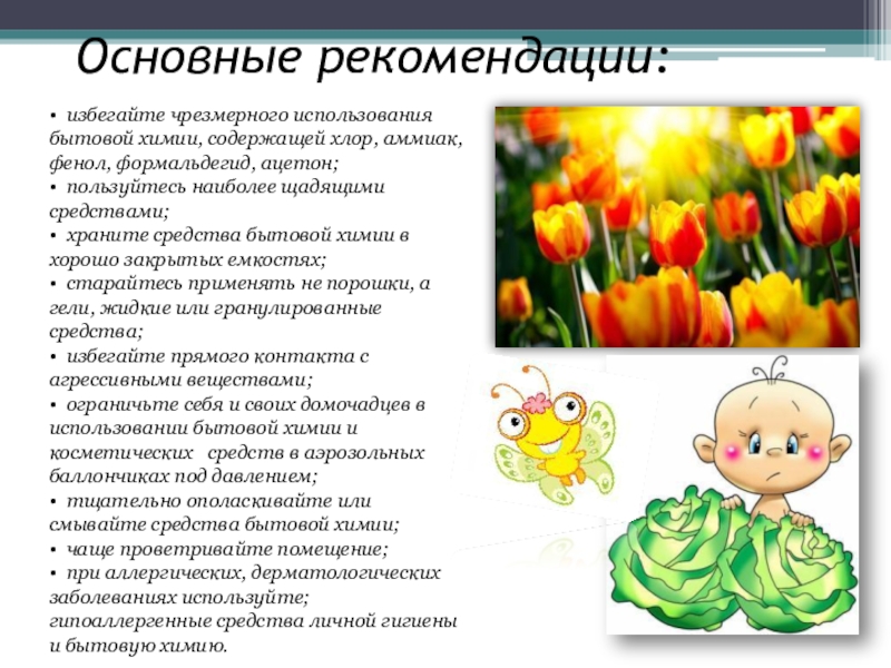 • избегайте чрезмерного использования бытовой химии, содержащей хлор, аммиак, фенол,
